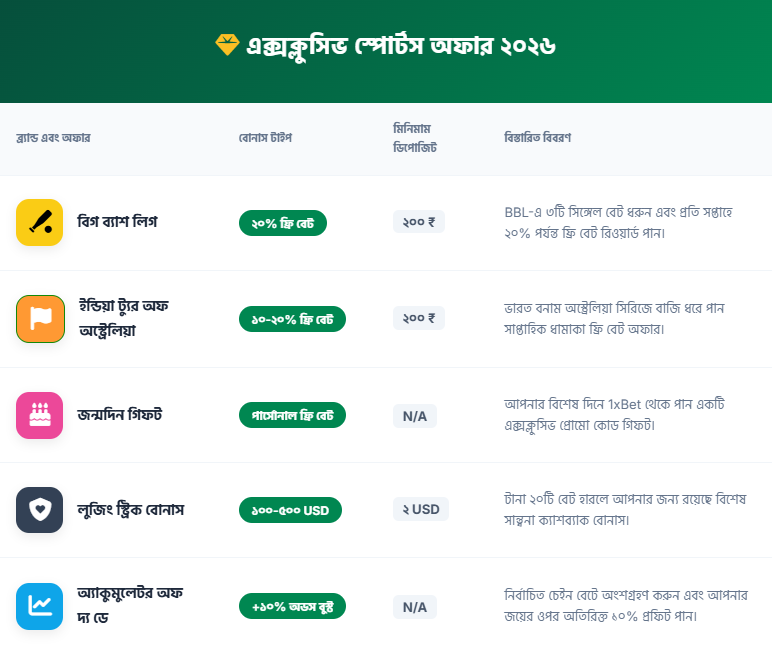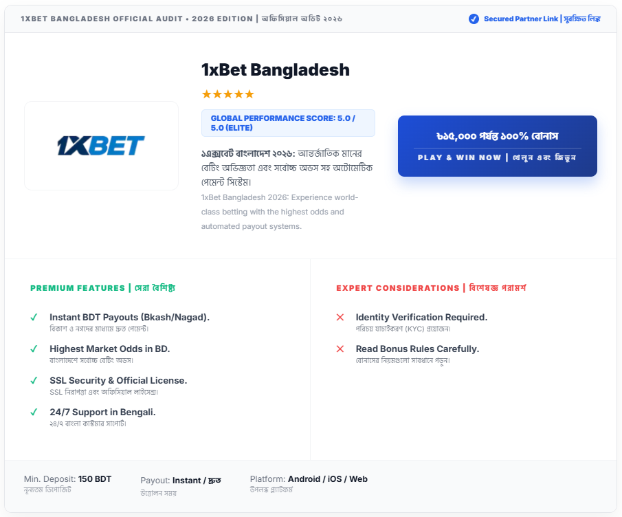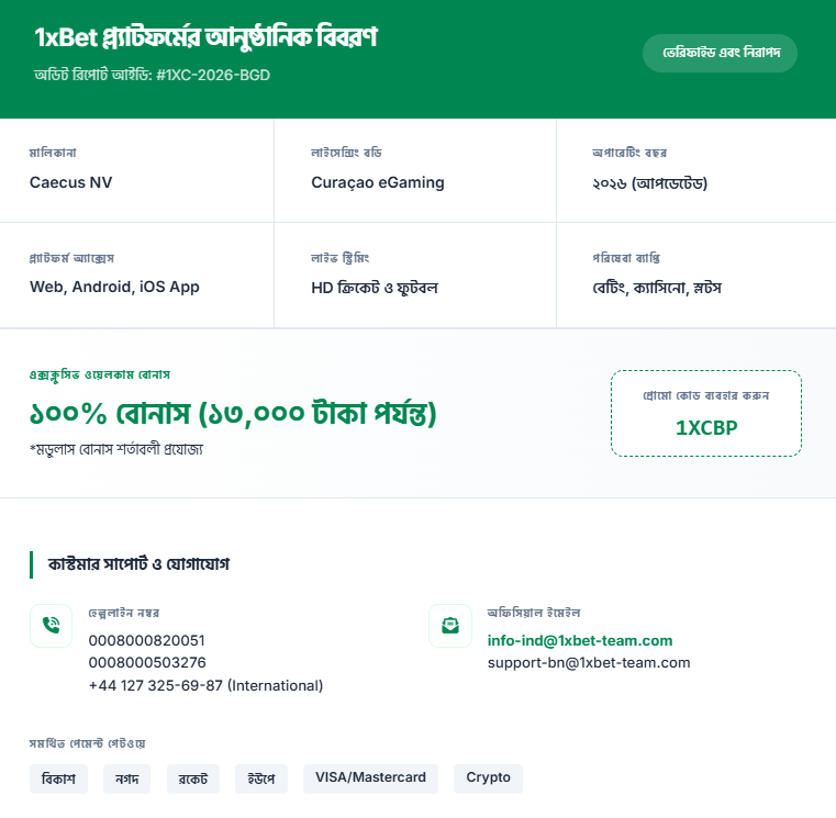 পরামর্শ: নতুনদের জন্য ওয়েবসাইটটি শুরুতে কিছুটা জটিল মনে হতে পারে, তাই আমরা মোবাইল অ্যাপ ব্যবহারের পরামর্শ দিই যা অনেক বেশি সহজ। যদিও কিছু বোনাসের শর্তাবলী বিস্তারিত থাকে, তবে আমাদের প্রোমো কোড 1XCBP ব্যবহার করলে আপনি শুরুতেই পাচ্ছেন ১৩,০০০ টাকা পর্যন্ত চমৎকার ওয়েলকাম বোনাস।