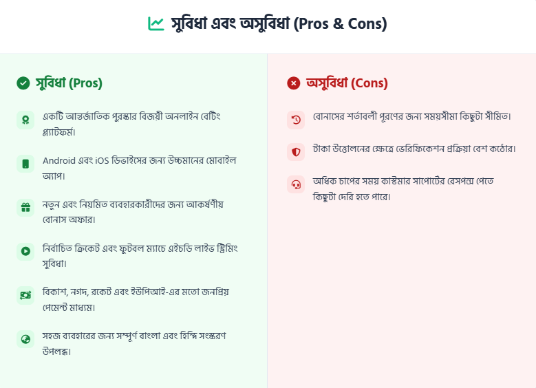 - ক্রিকেট ক্যাশব্যাক: বিপিএল বা আইপিএল চলাকালীন নির্দিষ্ট ম্যাচে বাজি ধরলে পান আকর্ষণীয় ক্যাশব্যাক সুবিধা।