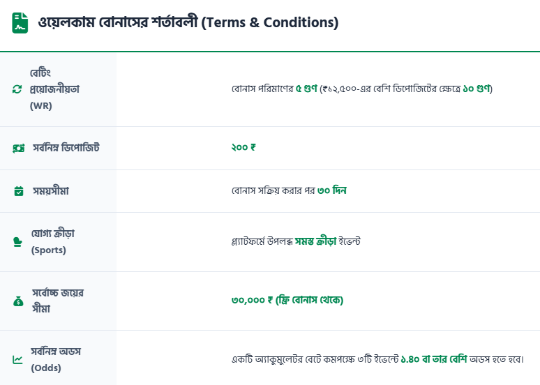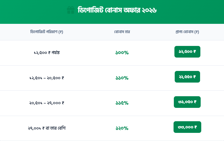 - এক্সক্লুসিভ ওয়েলকাম প্যাকেজ: নতুন ইউজার হিসেবে জয়েন করলেই পাচ্ছেন ১০০% ম্যাচ বোনাস, যা আপনার প্রথম ডিপোজিটে ১৩,০০০ টাকা পর্যন্ত বাড়তি মূলধন যোগ করবে।