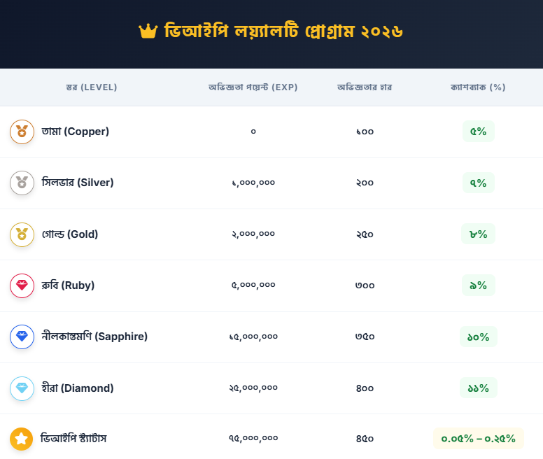 - ভিআইপি স্ট্যাটাস: সর্বোচ্চ স্তরে পৌঁছানোর পর আপনার ক্যাশব্যাক আর হারের ওপর নির্ভর করবে না, বরং আপনার প্রতিটি বেটের (Win or Loss) ওপর ভিত্তি করে রিওয়ার্ড দেওয়া হবে।