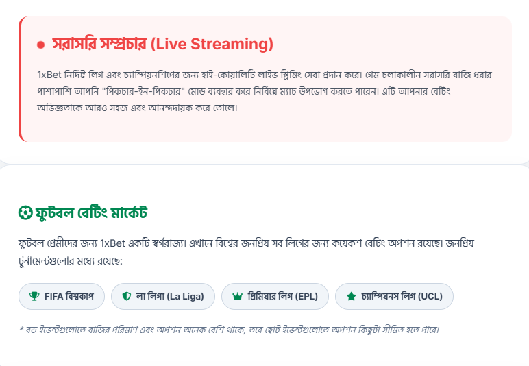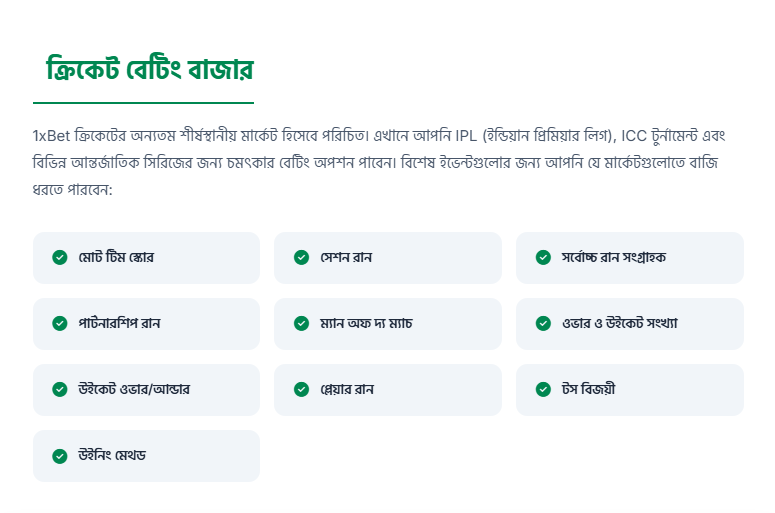 দ্রষ্টব্য: যদিও কিছু নির্দিষ্ট অঞ্চলে মার্কেট সীমাবদ্ধ মনে হতে পারে, তবে ২০২৬ সালের নতুন আপডেটে ১এক্সবেট বাংলাদেশের জন্য তাদের ক্রিকেট ডিরেক্টরি আরও সমৃদ্ধ করেছে, যা এখন আগের চেয়ে অনেক বেশি বিস্তৃত।