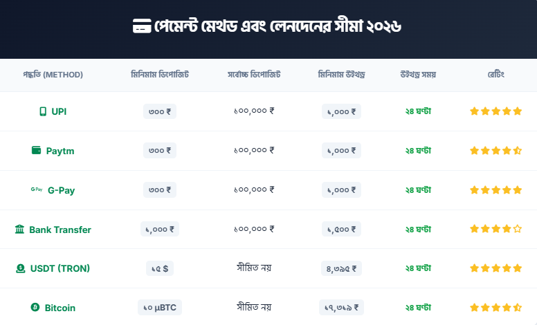 - নিরাপদ লেনদেন: বিকাশ, নগদ এবং রকেট-এর মাধ্যমে দ্রুত টাকা জমা ও উত্তোলনের নিশ্চয়তা।