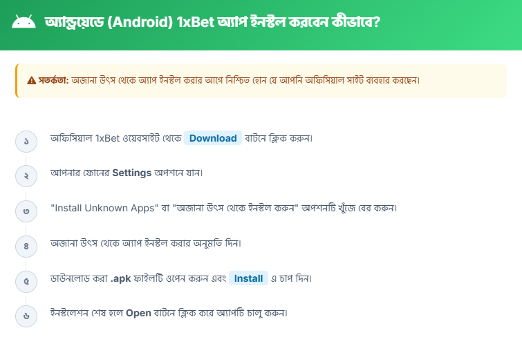 পরামর্শ: সেরা বেটিং অভিজ্ঞতার জন্য আমরা সরাসরি ১এক্সবেট অফিসিয়াল ওয়েবসাইট থেকে অ্যাপটি ডাউনলোড করার সুপারিশ করছি।